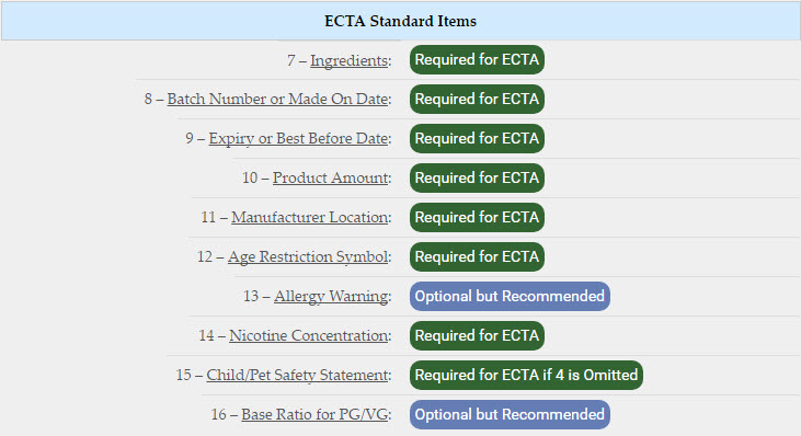 The purpose of this agenda item was to give an overview of the additional requirements ECTA members must adhere to such as VG/PG ratios and “Made on” dates. The intent was to demonstrate how these items fit on the already compliant labels, given their likely inclusion in the regulations.
